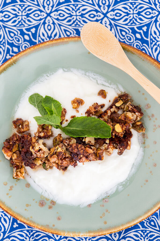 Misschien niet super gezond, maar wel om je vingers bij af te likken! We noemen dit baklava anders omdat er flink wat honing, pistache en walnoten in zit. Van deze drie ingrediënten vind je er normaal 2 in de baklava. Maar zonder de geraffineerde suikers en deeg kun je er ook iets onwijs lekkers van maken. Eet het uit het vuistje of door de kokosyoghurt.