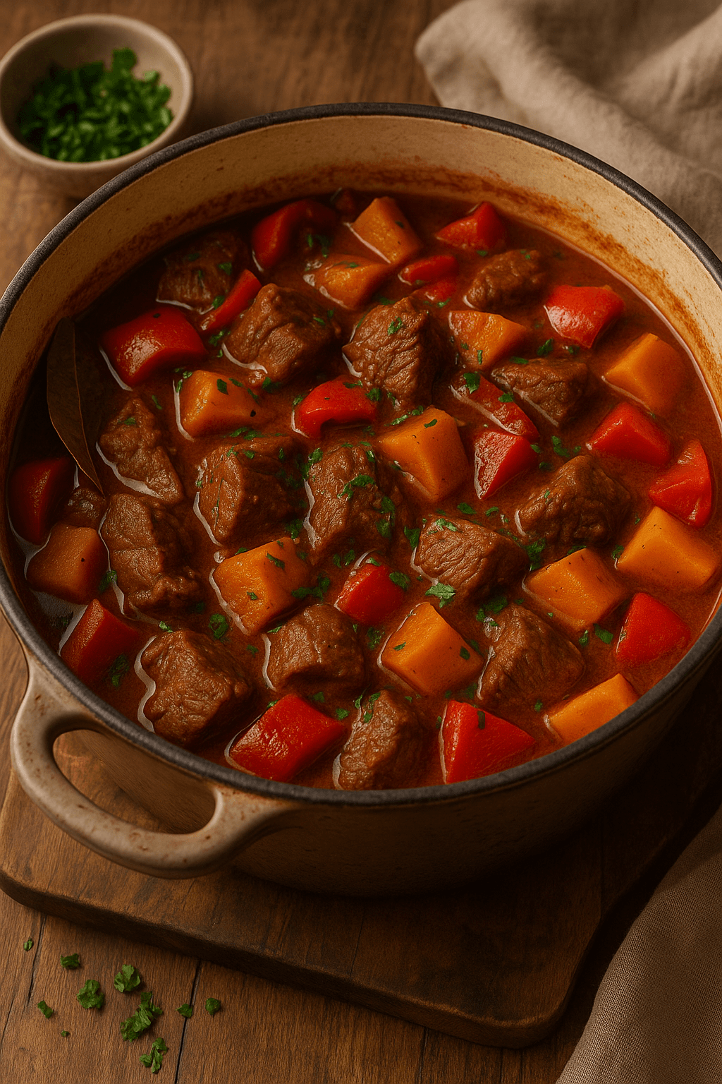 Goulash met Runderlappen, Paprika, Pompoen en Tomaten