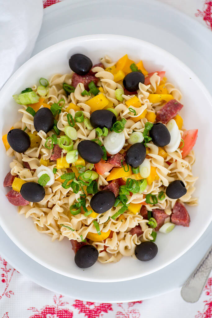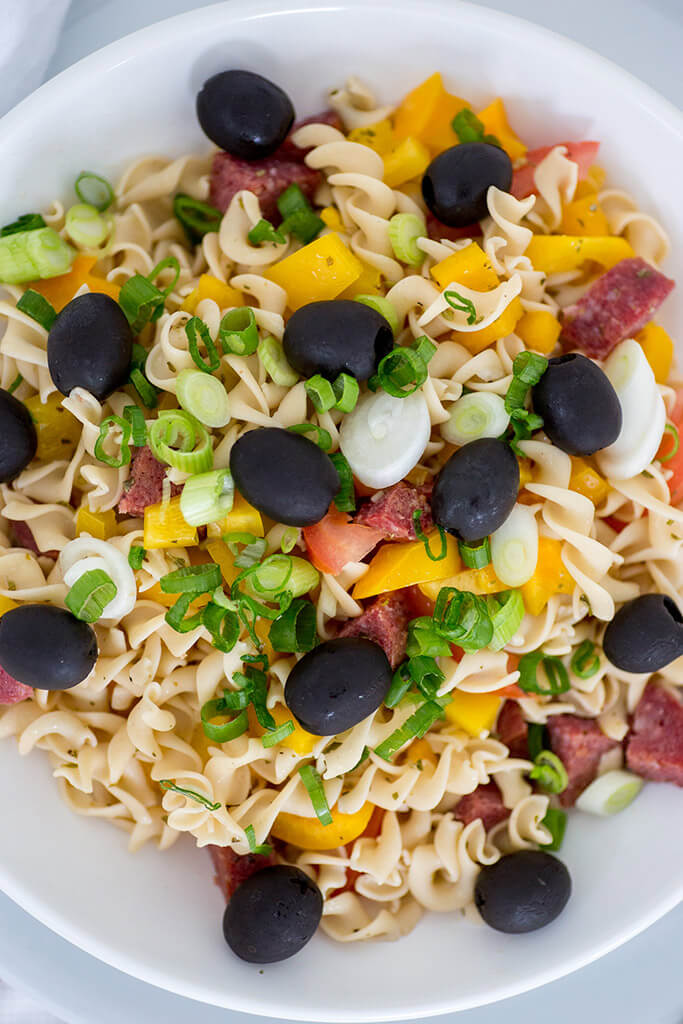 Meng in een kom pasta, groene paprika, tomaat, salami en olijven met de dressing.